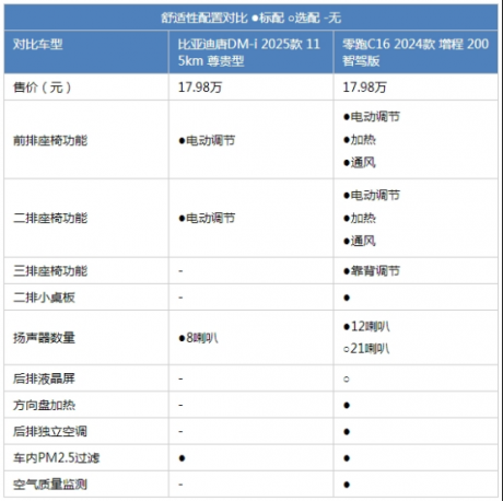 最后来到家用有关的舒适性配置上,我们售价拿为17.98万元的零跑C16增程200智驾版与比亚迪唐DM-i 115km尊贵型做配置对比,如果说比亚迪唐DM-i符合传统汽车的配置水平的话,那零跑C16的配置水平可以称得上是丰盈了。