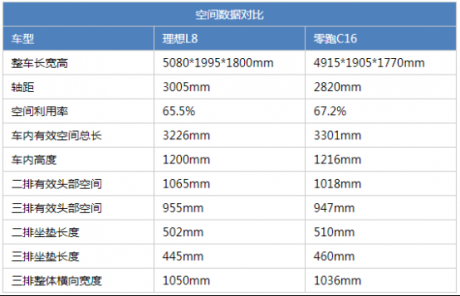 最后对比一下对于两车最重要的舒适性方面,首先是空间,两车车内的乘坐空间都很大,且都采用了2+2+2六座布局,主打三排平权。L8整体车身尺寸还有轴距要比零跑C16大,但是零跑的高空间利用率造就了其小车身大空间,比如车内有效空间总长、车内高度都是C16表现更好,并且在二三排的坐垫长度上,零跑C16都更长一点,能够在乘坐时提供更好的大腿承托性。