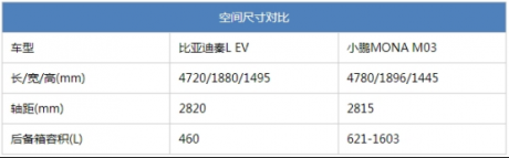 首先我们来对比一下两车的尺寸空间,其实两车级别上看,秦L EV是中型车,而小鹏MONA M03是紧凑级车,按理说差距应该不小,不过实际数据上两车相差的没那么大,甚至小鹏MONA M03还在长度和宽度上有所领先,但高度小了很多,反映到实际乘坐就是秦L EV的后排头部和腿部空间更加富裕,而小鹏MONA M03头部空间相对来说会局促一点。