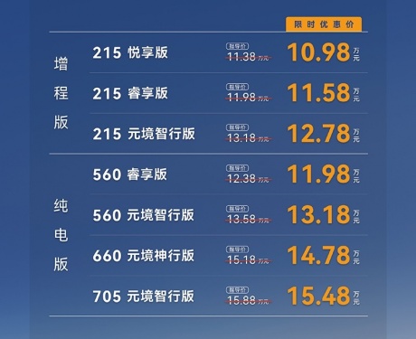 动力方面,新车搭载1.5L增程动力,其他发动机最大功率77kW,电机最大功率200kW,峰值扭矩360N·m。并标配宁德时代骁遥电池,CLTC纯电续航215km,综合续航1215km。纯电版提供两种不同单电机,最大功率分别为185kW、200kW,峰值扭矩分别为320N·m、360N·m。CLTC纯电续航提供560km、660km及705km。