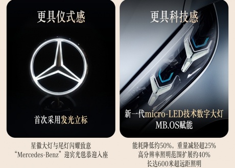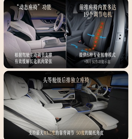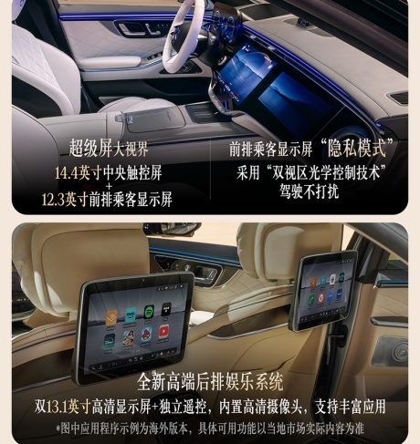 内饰方面,新车采用14.4英寸中控屏搭配12.3英寸仪表及12.3英寸副驾娱乐屏,内置最新MBUX智能人机交互。后排还提供双13.1英寸娱乐屏。新车将标配MB.DRIVE辅助驾驶,支持带车道居中功能和变道辅助功能的自适应巡航、智能泊车辅助系统,支持斜向停车,未来国内还提供城区及高速领航辅助驾驶功能,支持车位到车位辅助驾驶。