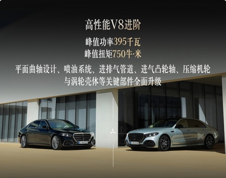 动力方面,新车提供汽油、柴油及插混动力。其中S 450 4MATIC搭载M 256 Evo直列六缸发动机,最大功率280kW,峰值扭矩560N·m;S 500 4MATIC最大功率330kW,峰值扭矩600N·m;S 580 4MATIC搭载全新的M 177 Evo V8发动机,最大功率395kW,峰值扭矩750N·m。