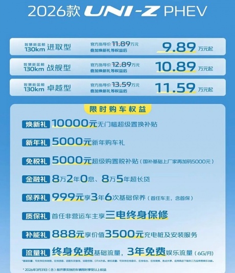 今日,2026款长安UNI-Z PHEV正式上市,共推出3款车型,售价区间为11.89-13.59万,叠加焕新礼等权益后售价9.89-11.59万。