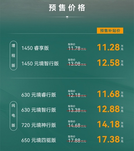 动力方面,新车搭载1.5L增程动力,其中发动机最大功率77kW,电机最大功率200kW。新车CLTC纯电续航230km,综合续航1450km。新车还将提供纯电版,续航可达720km。