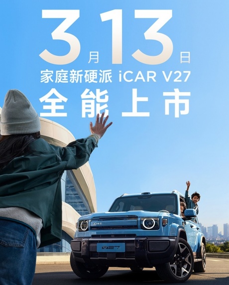 官方公布,奇瑞iCAR V27将3月13日正式上市。新车定位中大型SUV,此前已经开启盲订。